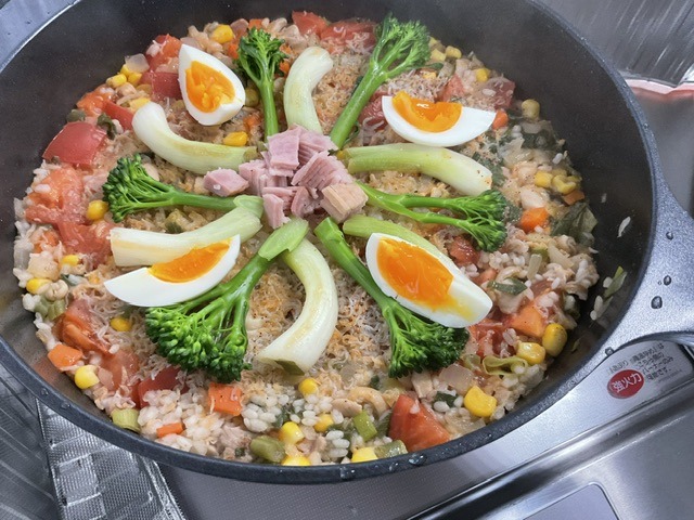 こんにちは、おかめです〓〓いきなりですが、昨夜のご飯です〓まずは出来上がりです。パエリアを作りました!母と2人なのに、たっくさん作りましたが···
